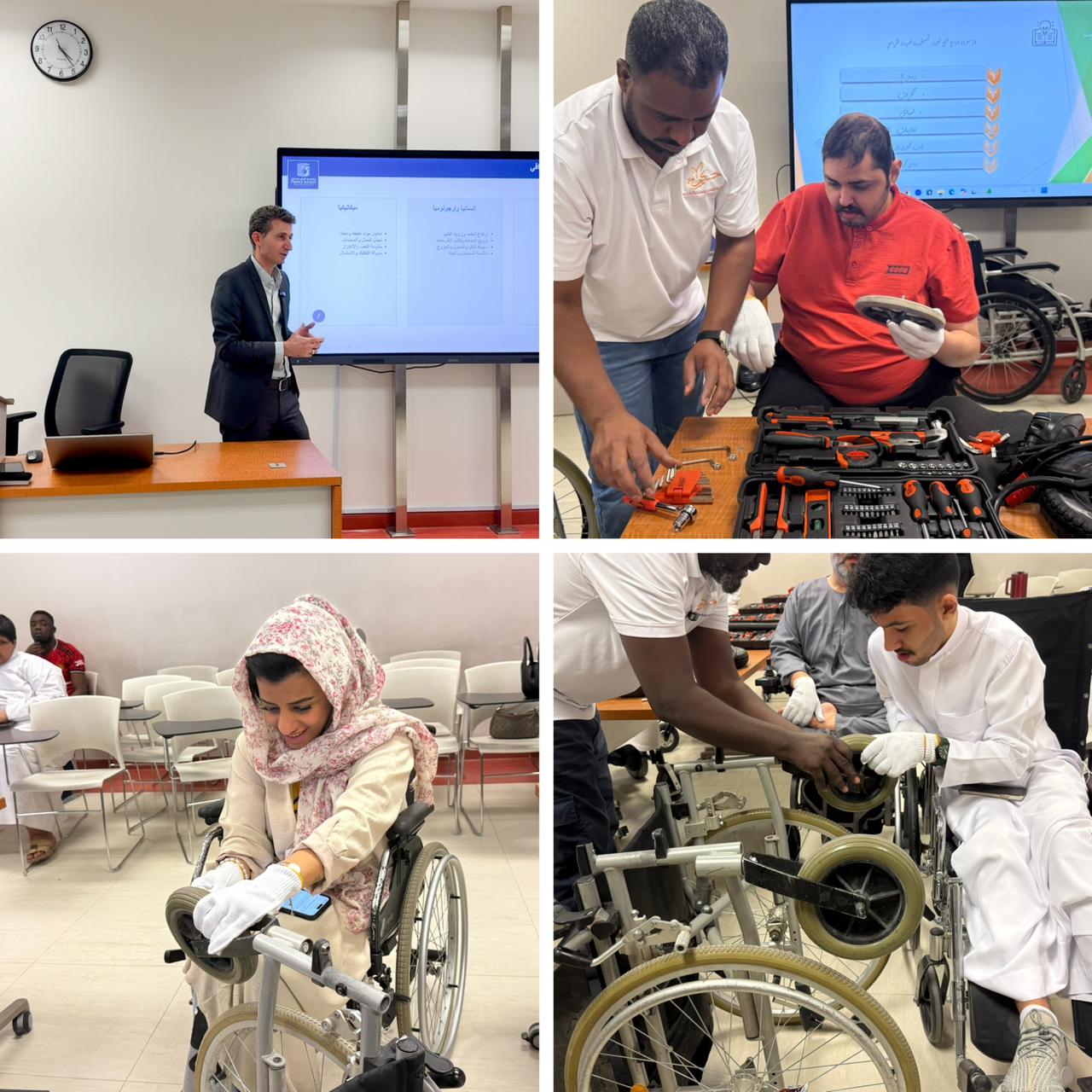 وتناولت الورشة تدريب المستفيدين على صيانة الكراسي المتحركة وتعزيز مهارات الاعتماد على النفس والتعامل مع الأعطال الدورية.